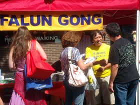 一位华人妇女来到摊位前,她告诉学员自己九九年之前在国内炼过法轮功,后来因为中共打压而放弃了。学员们鼓励她把握海外自由的环境,从新走入修炼,不要错过万古机缘。她记下了中国城炼功点的时间地点,表示要来学法(读大法书籍)。