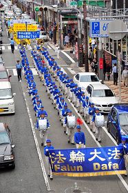 据当地法轮功学员介绍,第一次在这个繁华地段取得定点演奏的许可,是当地学员多年坚持给警察讲真相的结果。一位当天在游行中负责发真相传单的法轮功学员对笔者说:在大阪和神户,他都发出去了很多传单,有许多人是看到游行队伍后主动向他要真相资料的。