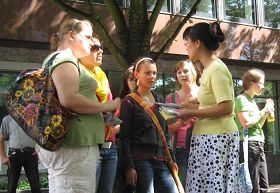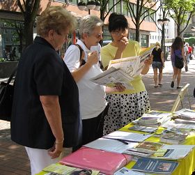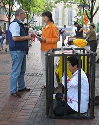 ![]() 在摊位前了解法轮功无辜被中共迫害真相 |
