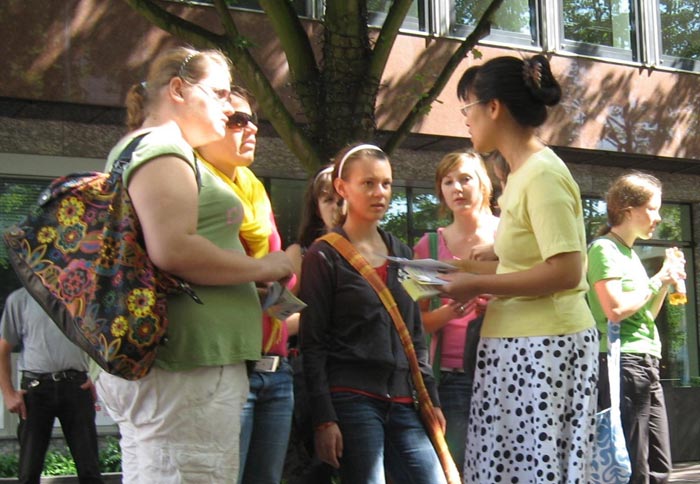 在征签表上签字后,她们又来到模拟酷刑的法轮功学员面前。学员用英语讲述他自己在中国劳动教养院被警察用电棍迫害的故事,会英语的女孩子快速地把真相翻译给她的小伙伴。这些让她们非常震惊,不敢相信二十一世纪的今天居然会有这样践踏人权的事情在中国大范围发生。