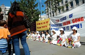 伴着庄严慈悲的“普度”乐曲一路前行的游行队伍引起路人的关注。无数关切的目光,投向身着白衣的法轮功女学员手持的被迫害致死的中国大陆同修的照片,也投向游行队伍打出的系列中英文横幅和标语:“法轮大法好”、“世界需要真善忍”、“停止迫害法轮功”、“对法轮功的迫害已经十年,立即停止迫害”、“声援五千九百万中国人退出中共恶党”以及“解体中共 制止迫害”等。