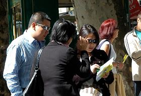 ![]() 三位中国人认真阅读法轮功真相传单 |