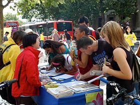 ![]() 在圣马丁广场,人们纷纷签名谴责中共迫害法轮功 |