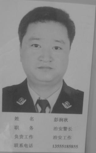 二零零二年五月早四点多钟,片警彭涧秋领着一群警察对所管辖地区的大法弟子进行了疯狂的查抄,查到大法资料和书籍,有近十名大法弟子被绑架扣押在看守所。彭是片警组长,每次都很卖力气,上边领导怎么说,他就怎么做,让他跟着做坏事他也干。一次他去大法弟子家叫大法弟子的妻子签字,他妻子(未修炼法轮功)严厉拒绝了彭,并说:“要抓人你们就领走,我才不签字呢!”彭没办法,为了交差,自己签了字,灰溜溜地走了。有一次,在社区,彭在和一个人交谈,说法轮功时,彭没好气地说:“是学法轮功的,把他们的一切待遇都断了……”可见此人邪恶。