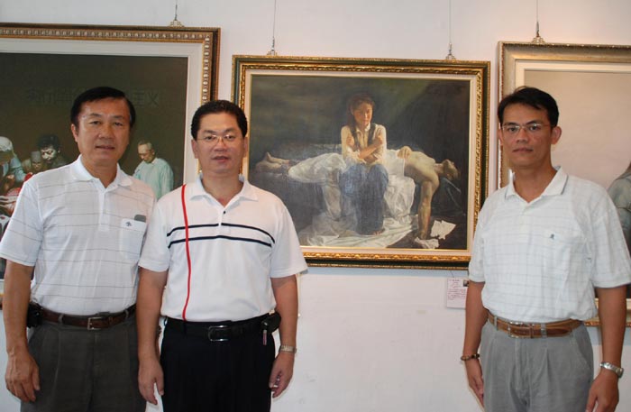 屏东县警察局恒春分局黄副分局长(中)说:国家及警察应协助、保护人民。警察局郭巡官(右)表示:没看过这么真实的画展,这是一个难得的机会。