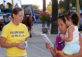 【明慧网二零零九年九月十一日】一年一度的加州博览会二零零九年八月十四日至九月七日在美国加州首府沙加缅度的加州展览馆举行。当地法轮功学员在博览会期间的每个周末都来设置展台,向众多游人介绍法轮大法(又称法轮功)的美好,并讲述大法修炼者在中国大陆被中共残酷迫害的真相。