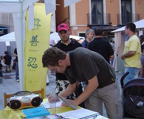 法轮功学员在摊位前演示五套功法,并向路过的游人征集呼吁制止中共迫害法轮功的签名。签名簿上揭露的中共活摘法轮功学员器官的暴行,使生活在这里的善良民众非常震惊。