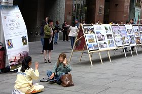 九月十四日是星期一,法轮功学员在商务中心马丁街又一次摆出真相展版和酷刑展,向商业中心的公务人员揭露中共对法轮功学员的残酷迫害,为反迫害征签。在中心舞台上,法轮功学员表演五套功法和现场教功,一旁的学员用麦克风向路人讲解:“法轮功功法已弘传到了一百多个国家,人们从中得到了许多美好的体验。然而在中国,中共对法轮功学员的残酷迫害还在发生着,并且已经持续了十年。希望大家自由加入学炼法轮功,并向法轮功学员了解真相。”