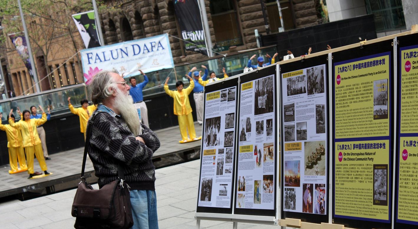 在Belmore公园,摆出的真相展板有六、七十米长,许多路人都驻足观看。一位从中国大陆来留学的女生告诉退党义工,她原来对共产党“活摘法轮功学员器官”的事一点不了解,看了这些图片和义工介绍后很震惊,她表示愿意退出共青团,并用了“良知”这一化名来声明退出。