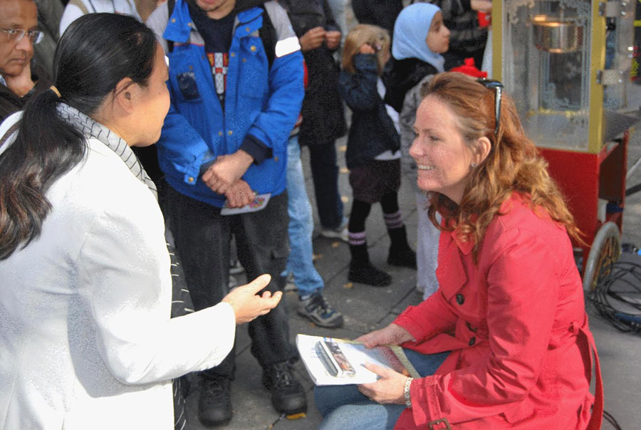 ![]() 左派党奥斯陆第二参选人乌拉·埃尔万斯图恩听取法轮功学员介绍《九评共产党》 |