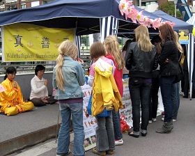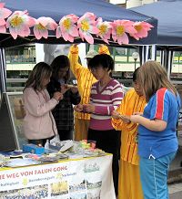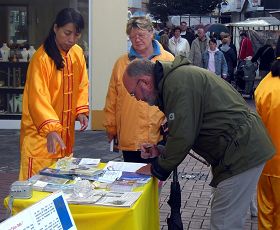 一位中国人听说城市节中有法轮功的展位,特意过来看看,当看到法轮功学员这么公开地在海外炼功并受到城市节主办方的大力支持,他显得既高兴又惊讶。