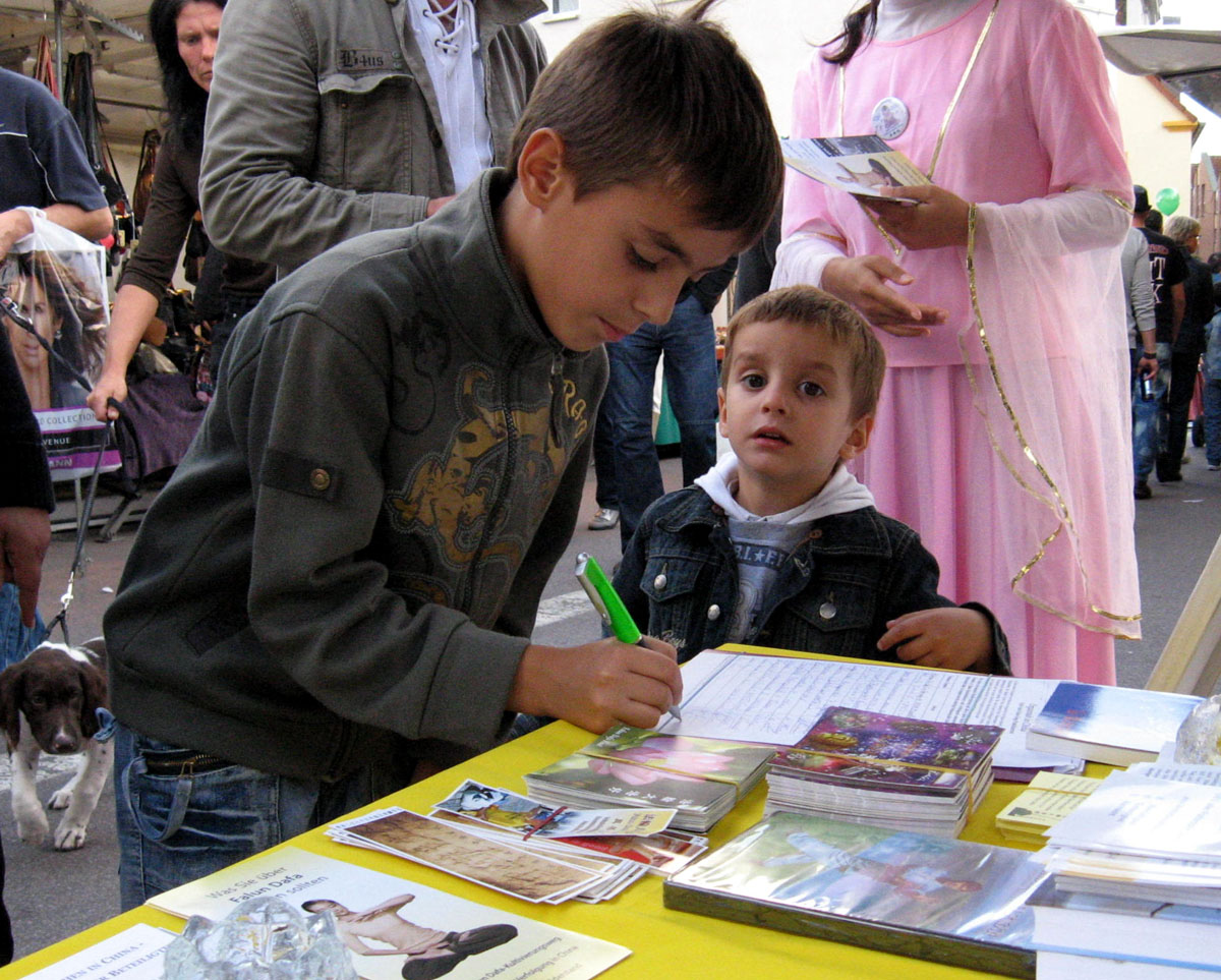 一对德国夫妇,第一天了解真相后,太太在“制止中共活体摘取法轮功学员器官”的征签簿上签了名,但是丈夫没有签字。第二天丈夫明白真相后,特意来到法轮功展位前,在征签簿上签名。