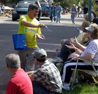许多小孩子从其他的游行车队拿到各种各样的糖果,而法轮功学员给他们的是更有意义的礼物——一个印着大法小弟子打坐的介绍法轮大法的书签。因为时间的关系,学员没有发给每一个小朋友,但是往往其中一个小孩从学员手中得到了,另外的都纷纷围上来期待得到这份特殊的赠品。