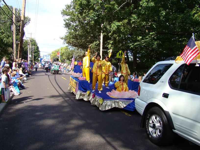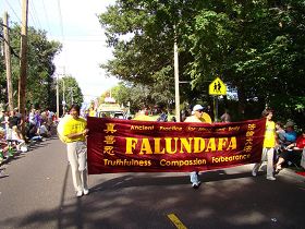 法轮功学员的花车以美丽的莲花为主要装饰,花车上,功法演示舒缓祥和,队伍前方,“法轮大法——真善忍”的横幅十分醒目。与众不同的法轮大法方队,吸引了许多行人的目光,赢得了由衷的赞叹和掌声。
