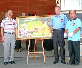 ![]() 左起:龟山乡乡长秘书林文能、民众服务社理事长邓庆辉、龟山乡长庚村村长方振华为“真善忍美展”揭画 |