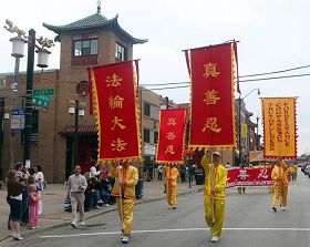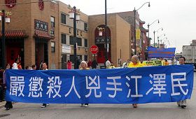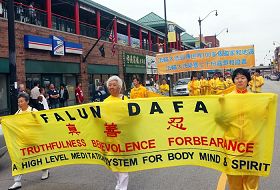 长期以来,芝加哥学员持续地在利用周末的时候在中国城炼功、讲真相、劝三退(退出中共党、团、队)。随着中国城里明白真相的人越来越多,华人的态度也在悄悄地变化:游行过程里,有的华裔家长指着横幅在教孩子读念,并欣然接受了真相资料;有的微笑友好地冲学员挥手,有的告诉同伴:“我在看法轮大法的队伍呢!”更多的华人举起相机,留下这个美好的场面。