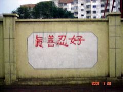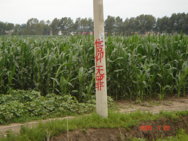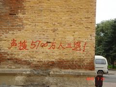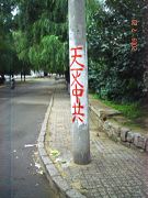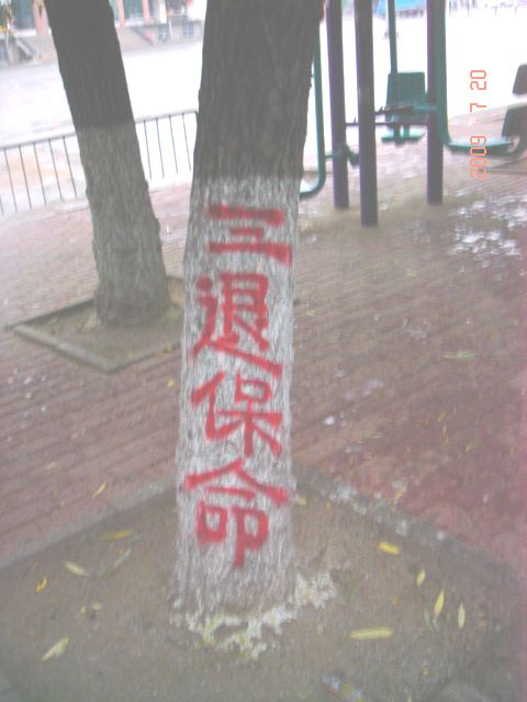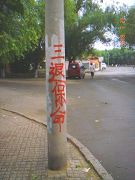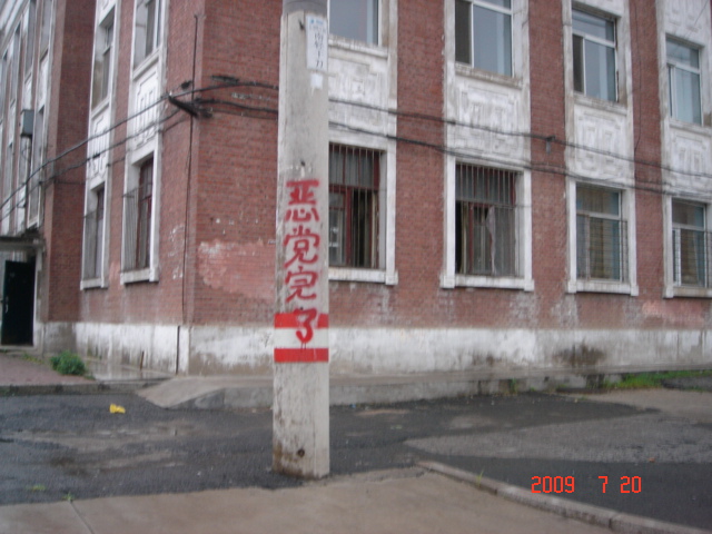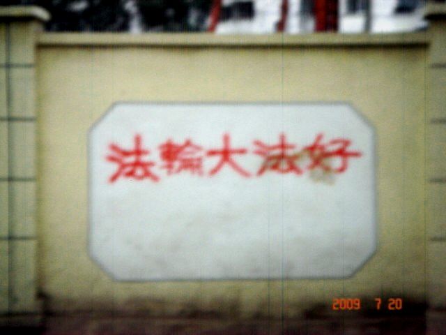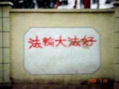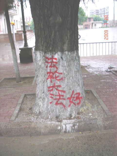 这是在大陆东北某市城乡道路两边的电线杆上、大树上、家属楼的墙上、家属楼的门上、学校周围的大树上及体育广场的立柱上等地方出现喷漆和不干胶标语:“天灭中共、退党保命”、“声援五千七百万人退党”、“驱除中共恶党,还我中华”、“真善忍好”、““法轮大法好”、“停止迫害,信仰无罪”、“平反法轮功,法办江泽民”等;