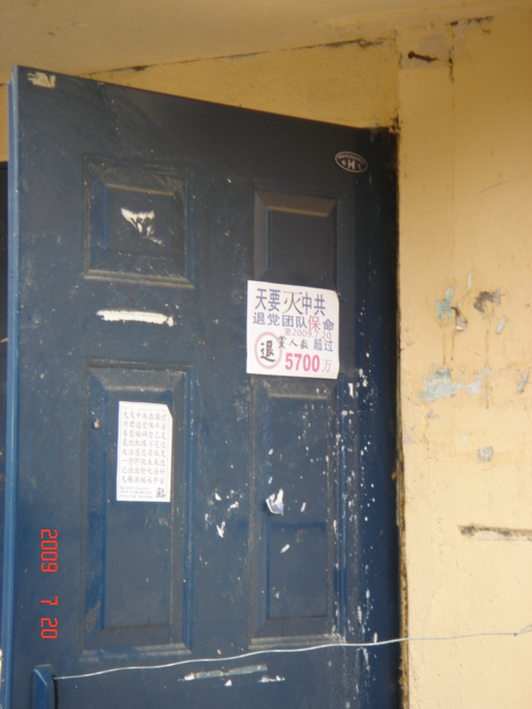 不干胶上写着:“天灭中共,退党团队保命,截止2009年7月20日三退已超5700万人”、“九评掀起5700万人退党团队”、“中国大陆公安国安迫害法轮功恶报知多少?”、“立即停止对法轮功的迫害”、“警察觉醒了”、“迫害法轮功彻底失败了”、及退党声明等。