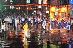 ![]() 台湾基隆中元祭放水灯游行,滂沱大雨之后,街道两旁仍挤满了观看游行的民众。 |