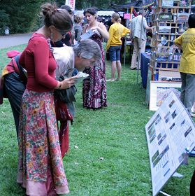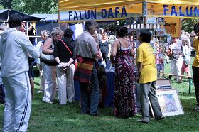 今年的法轮功展地在露天绿草地的入口处。当人们走进入口处,就会被缓、慢、圆的法轮功功法吸引着走近展位的资料桌,询问和取阅资料。来来往往的人们,一拨又一拨。