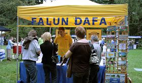 晴朗的天空,绿茵的草地,令节日活动更加生机勃勃。法轮功学员的展地上,黄帐篷、资料桌、法轮功修心健身的图片说明,还有介绍发生在中国的迫害真相的展板。
