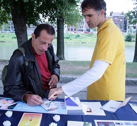 汉科内特先生(Denoit Henkinet)是一位为政府服务的社会工作者。他说自己是一个为了别人而忙碌的人。当他听到学员尼克(Nico)介绍法轮大法的修炼原则是“真、善、忍”后,马上询问哪里可以阅读到《转法轮》一书。他说:这正是他所需要的。学员告诉他法轮功书籍在法轮大法网站上,可以免费下载。他高兴地询问了网址,表示回去后一定上网站浏览。