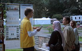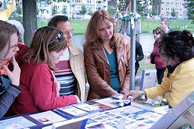 前来参加活动的人们被法轮功祥和的音乐和柔和功法所吸引,展位前的游客不断。法轮功学员繁忙而和善地接待着每一个询问的人,回答他们的疑问,满足他们的好奇心。