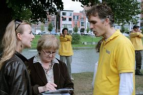 何女士和她的女儿来到法轮功展位前,告诉学员说:我们是专门来找你们的。你们有神韵艺术团演出的光盘没有?我们非常想看到这个演出,我们想买光盘。因为神韵在安特卫普市演出时,时间不适合我们观看,所以我们没能看到。