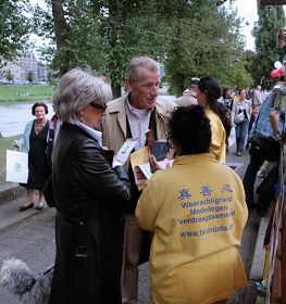 斯德范纳托先生和爱拉卡瑞女士(France Stevanato 和Soraya Elakari)听了学员对法轮大法“真善忍”的讲解后马上说:“中共一定不喜欢这三个字。谢谢你告诉我这三个字的意义。我要买《转法轮》这本书回去看。”他们留下了电子邮件地址,希望得到更多关于法轮大法的信息以及炼功点的情况。