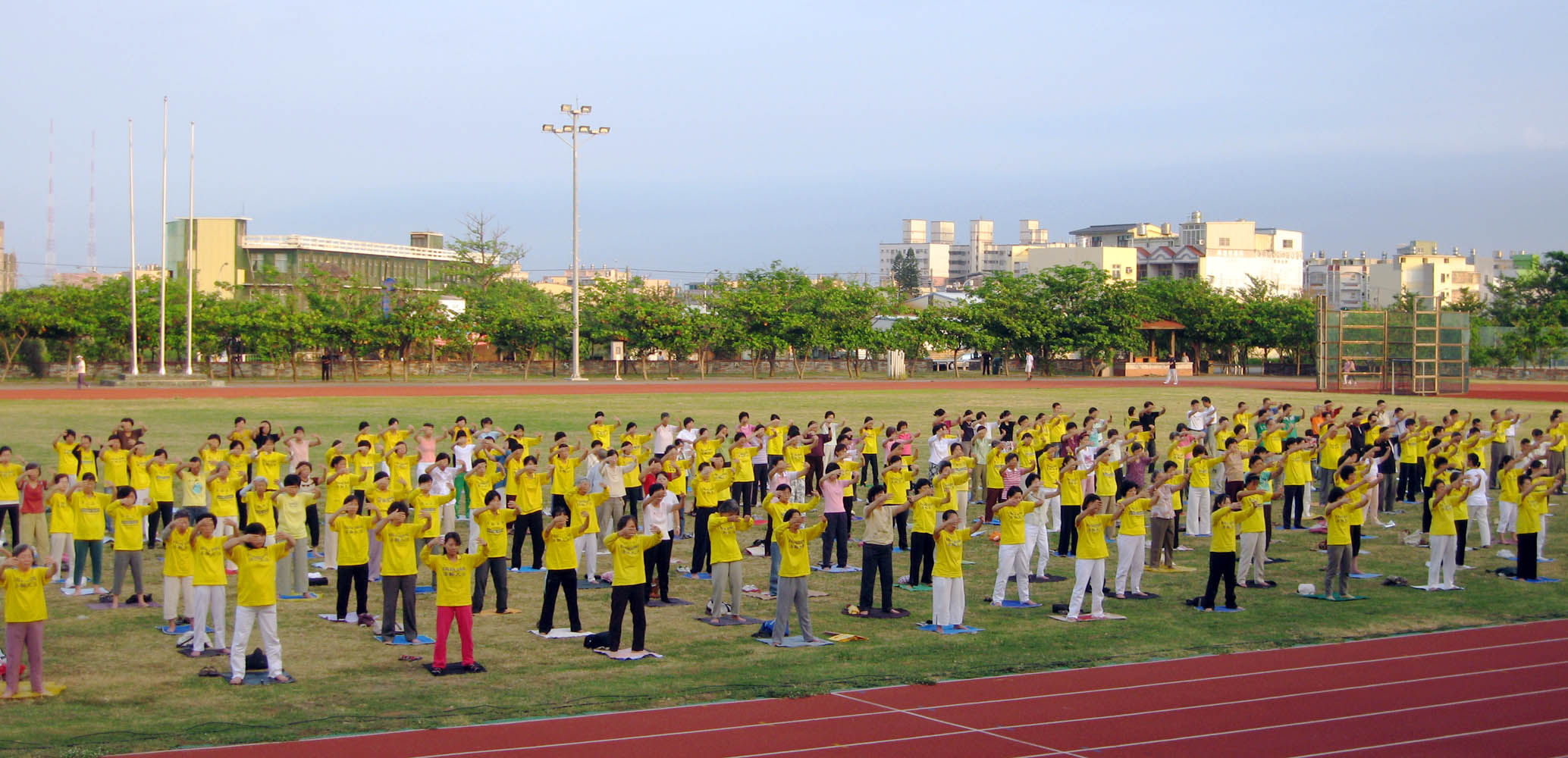 二零零九年九月六日,台湾中区法轮功学员在彰化县鹿港立德会馆前运动场晨炼