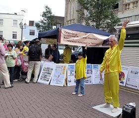 学员们注意到有一些人在真相信息台附近停留良久,或者走了又来,就是为了有机会多了解一些法轮功真相。一位中年英国男士在反迫害征签表上签字后离开,过了一会儿又来了,眼睛在桌子上的真相资料间仔细搜寻。这时一位学员递给他一个英文《九评共产党》真相光盘,告诉他看了这个能明白中共邪党为什么迫害法轮功,又给他找了一份讲真相的英文专刊报纸,接过这些真相资料后,这位英国人满意地离开了。