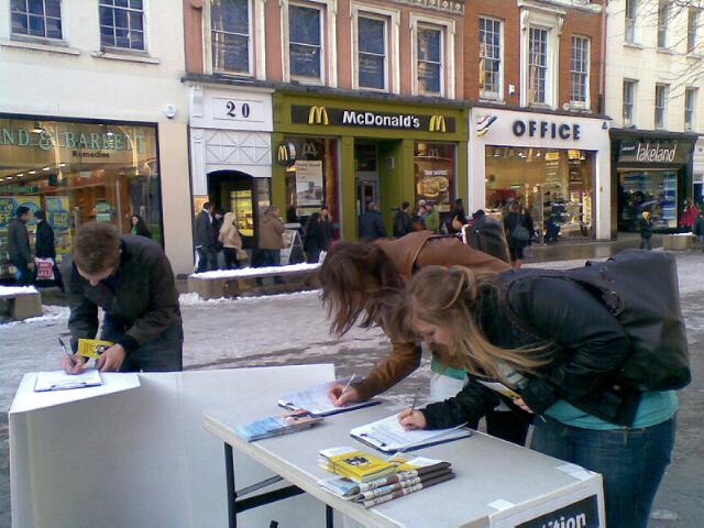 法轮功学员们将真相展板摆放在曼彻斯特市中心的步行街上。街道上大块的冰雪尚未溶化,街上的人也比平常少很多,但是,即使在这样的情况下,法轮功学员的展位仍然吸引了很多善良的曼彻斯特人驻足观看,并在请愿表上签上他们的姓名,表达对法轮功学员反迫害的支持。