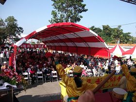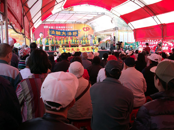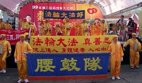 ![]() 法轮功学员组成的唐鼓队上台表演,受到乡民的欢迎。 |