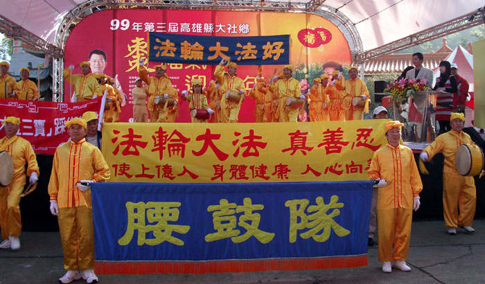 踩街活动早上八点在大社乡公所前出发,由乡长引领到会场。参与团队有各村社区及协会社团,包括法轮功学员组成的腰鼓队及唐鼓队,学员沿途发放真相资料,并讲述大法的美好,受到乡亲欢迎。有些乡亲问起哪儿可学功及中共为何迫害法轮功,学员耐心地述说,进而打开内心疑虑。到主会场后,腰鼓队及唐鼓队轮流上场演出,受到全场鼓掌欢迎并和乡长合影纪念。