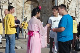 法会开始前,学员们在耶路撒冷旧城的雅法门(Jaffa Gate)炼功。学员们的活动吸引了许多游客。这是讲真相的好机会。学员们向游客派发真相资料,并请他们在制止迫害的请愿信上签名。