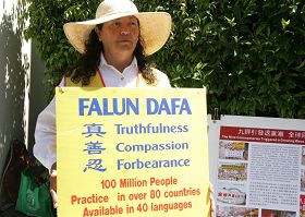 莫娜不断地学法,遵循“真、善、忍”的原则,她认为这是她十年修炼历程的根本保证,也是能使她精進的动力。现在她每天早晨六点半准时将法轮功的真相展板、横幅和真相资料送到中领馆前,然后开始炼功。经常有西人前来学功,莫娜就认真地教他们。炼完功后她就向路人发放真相资料。她说会坚持到彻底结束迫害的那一天。