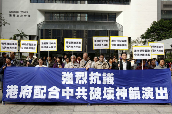 数十名买了神韵票的观众下午自发到入境处前,抗议港府无理拒发演出签证给神韵团员。他们中有不少是从海外来的神韵迷,其中包括特意从纽约飞到香港的李娟。她于二十五日抵港后才得知神韵被迫取消,感到非常失望。她说,神韵晚会在全球都很受欢迎,自己在美国看了觉得非常好,所以想介绍大陆亲戚一起来香港看。