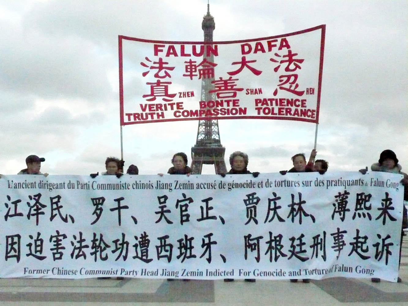 “江泽民、罗干、吴官正、贾庆林、薄熙来,因迫害法轮功遭西班牙、阿根廷刑事起诉”,在埃菲尔铁塔脚下,大陆来巴黎游玩的人们路过大横幅,或大声念着横幅,或掏出相机、手机“咔咔”的拍照。