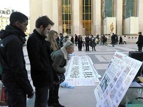 在巴黎人权广场,各国的游客读到展板上的介绍,纷纷上前来表示要签名支持。一位法国老人大声的说:“共产党很坏很坏,在法国他们干了很多坏事儿。你们能够在西班牙和阿根廷起诉中共的高官,了不起!”与义工聊起谷歌、活体摘取器官等事件最新进展时,一位法国中年人说:“审判独裁者是对全球负责!”