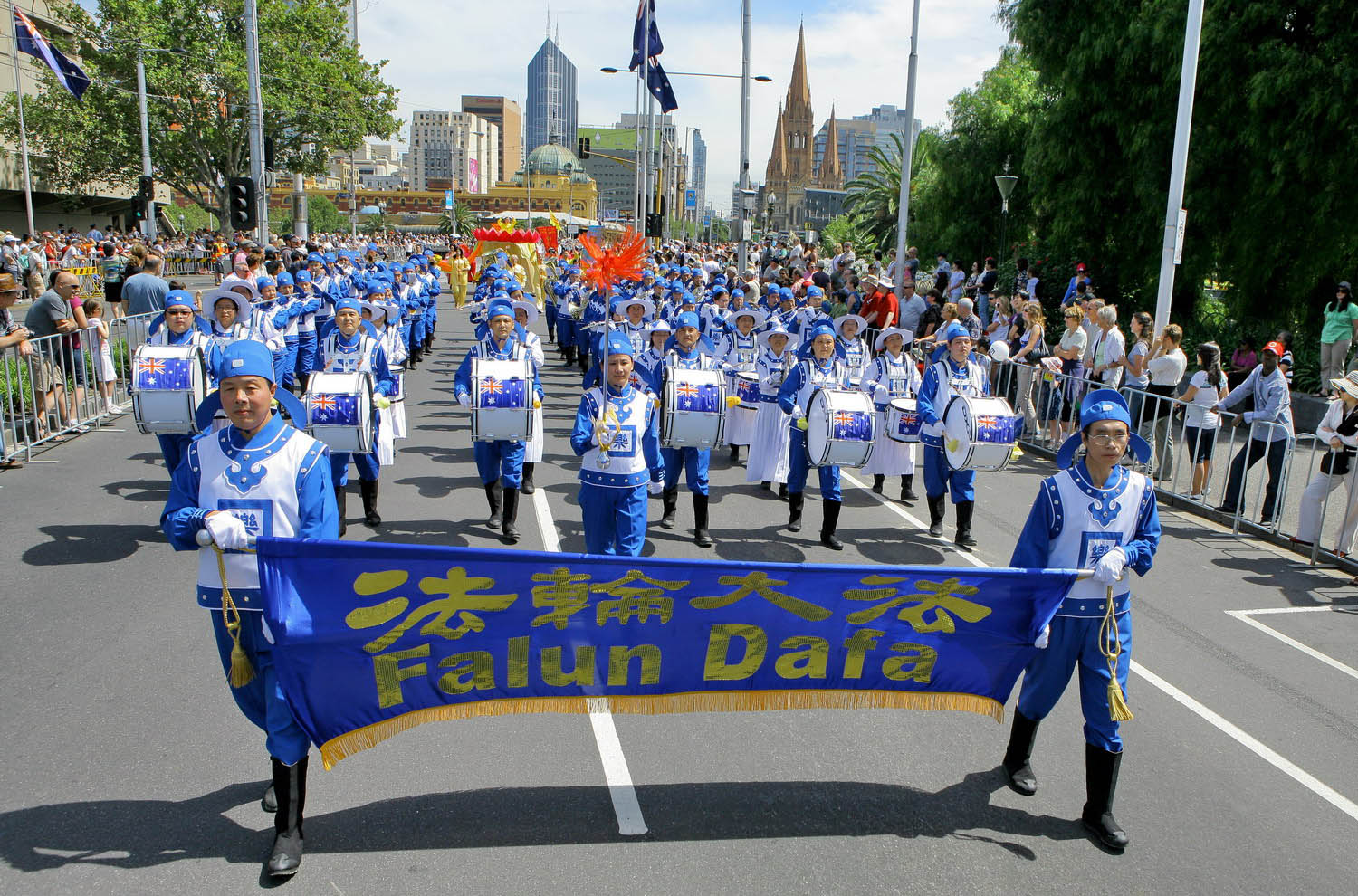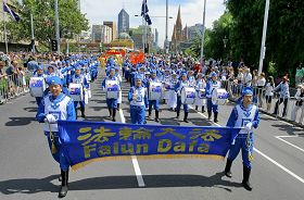 【明慧网二零一零年一月二十八日】二零一零年一月二十六日是澳洲国庆日,墨尔本国庆日的盛装大游行是各种庆祝活动的焦点,来自各族裔、各个社团的民众,身着五彩民族服饰,从最繁华的商业街Swanston Street载歌载舞,一路走到Alexandra 公园(Alexandra Gardens)。队伍中,有威武雄壮的天国乐团、有踩高跷的袋鼠人,还有各国民族文化的展示,令人眼花缭乱。