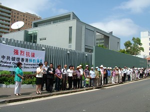 【明慧网二零一零年一月二十八日】(明慧记者罗娜、欣宇悉尼报道)二零一零年一月二十七日,近百名澳洲悉尼居民在中领馆前集会,谴责中共胁迫香港方面拒绝给神韵艺术团的技术人员的演出签证,从而破坏神韵在香港的演出,呼吁香港特区政府尽快纠正错误,归还香港居民观看神韵演出的权利。澳联社、大纪元、希望之声等中英文媒体记者也对新闻发布会进行了采访报道。