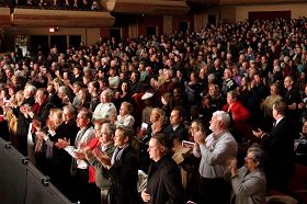 【明慧网二零一零年一月七日】(明慧记者章韵滑铁卢综合报道)二零一零年一月六日晚,神韵国际艺术团再次登临加拿大双子城基奇纳-滑铁卢,在当地最富盛名的剧院广场中央剧场(Center in the square)为中西观众奉献具有纯正中华传统内涵的、全善全美的晚会,拉开新一年度加拿大巡演的序幕。帷幕拉开,全场观众掌声雷动,人们无不被神韵艺术团精彩绝伦的艺术演出所倾倒。