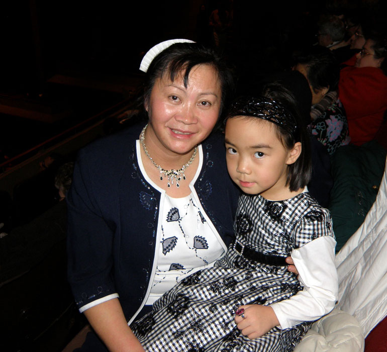 ![]() 一月七日晚,来自大陆的新移民李缘的一家五口,来共享神韵国际艺术团的演出。图为李缘和女儿。 |