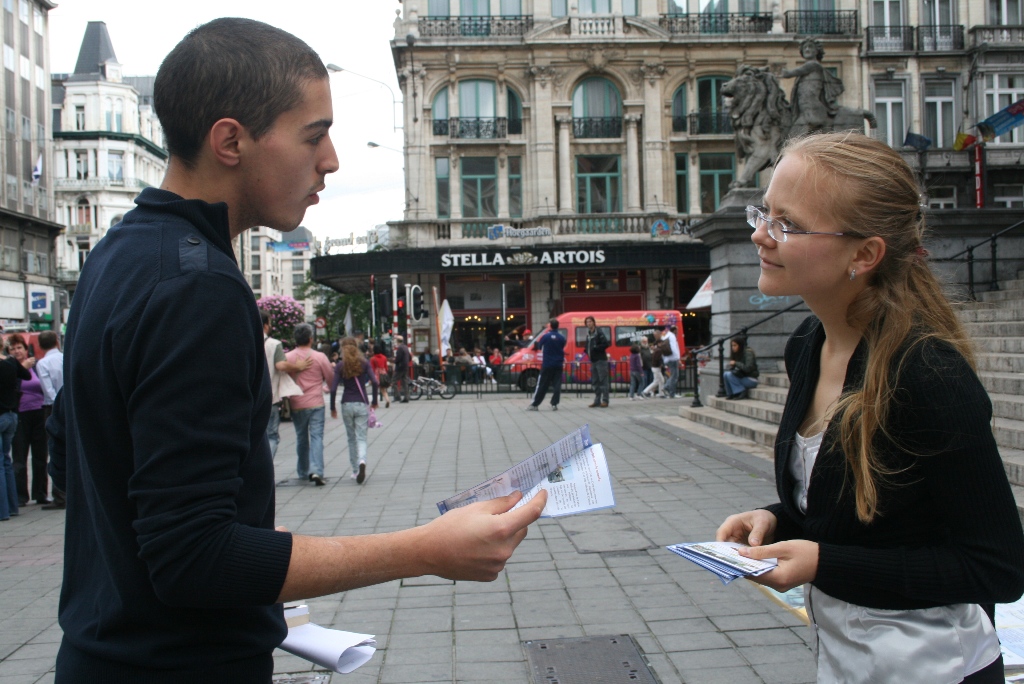朱女士说,现在“三退”(退出中共党、团、队)的大陆游客也多了。有个青年男子,下了大巴就走到资料桌跟前,大声地对帮助他照相的同伴喊,走近点、走近点照。她接着说:现在即使一些人还有怕心,不敢带资料回国,他们还是希望把在海外看到的景象带回国给亲朋好友看,就不停地对着有“比利时退出中共服务中心,解体中共才能制止迫害,中共停止迫害法轮功”等大字横幅照相片,录制录像片。她说:法轮功学员相信善恶有报是真理,讲真相劝三退为的是使被蒙蔽的中国人摆脱在加入其组织时要为其“献出自己的生命”那个邪恶的誓言捆绑,邪恶的中共遭报应的时候,免除一起遭恶报的牵连。