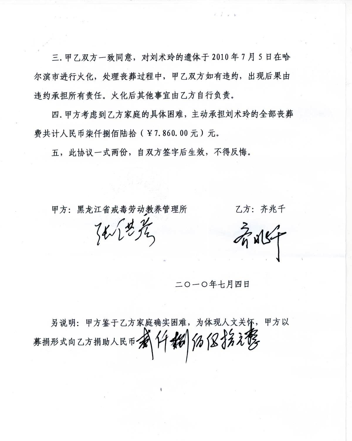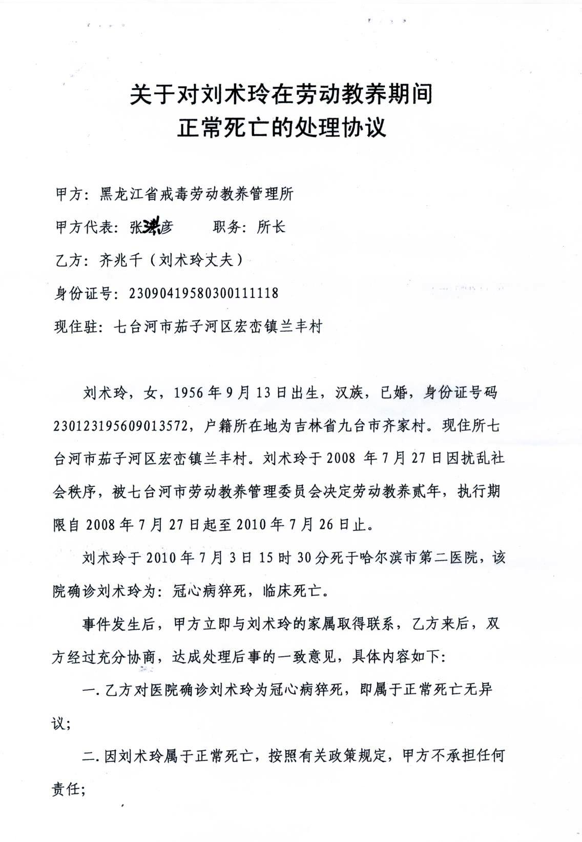 刘术玲家人焦急地连夜驱车赶到戒毒劳教所,令家属悲痛欲绝的是,刘术玲已经离开人世了,尸体被停放在南岗区西华苑殡仪馆。家属气愤地质问戒毒所的管理科科长杨名君等狱警:“我们人在家里好好的,怎么死在你们这里了?你们必须给做个解释。”他们一直支吾搪塞,并撒谎说:“刘术玲是冠心病猝死,并晕倒在卫生间里。”