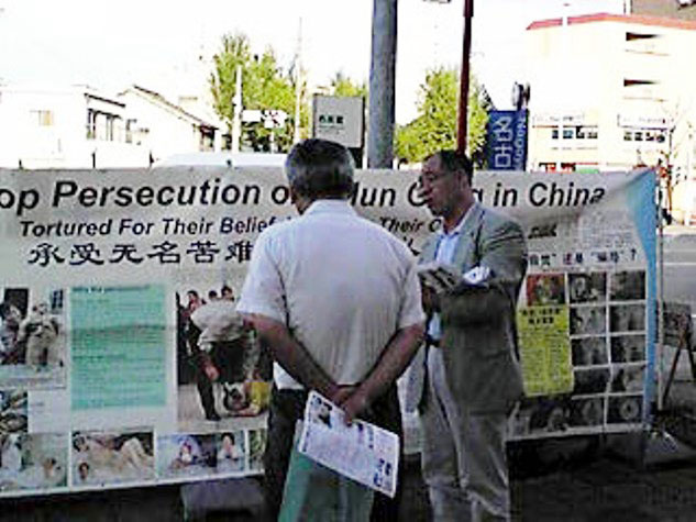 一对就住在名古屋国际会议场附近的日本夫妇,他们看到横幅上的内容后,问学员到底是什么原因法轮功遭受非法迫害?学员就告诉他们:“主要是法轮功从一九九二年由李洪志先生在中国大陆传出后,教人“真善忍”做个好人,祛病健身疗效显著,在短短的七年时间里炼功人数就达到将近一亿,超过了共产党的人数,前国家主席江泽民出于个人的妒忌和对这一广大群体的惧怕,一夜之间就发动了这场对信仰‘真善忍’法轮功学员的迫害。目前已被迫害致死的学员已超过了三千人,这还只是冰山一角。”