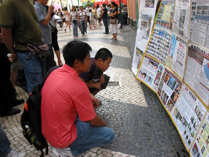在十月一日当天,澳门法轮功学员帮助约三百名大陆同胞办理了退出中共党、团、队的声明,当中很多是年轻人。以往办理三退的大部份是被中共迫害过的中年人;而近来,很多青年、少年人都加入了退出中共相关组织的行列。有的父母,带着儿女一起观看真相图片,最后全家人都声明退出曾经参加过的邪党组织。