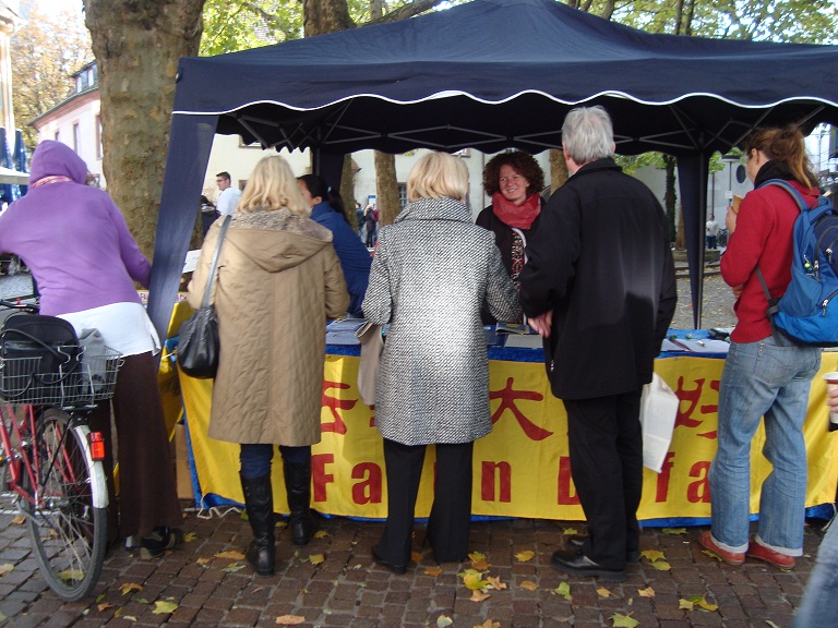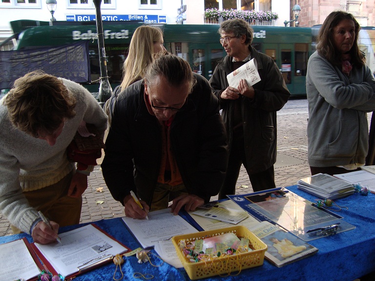 【明慧网二零一零年十月二十五日】二零一零年十月二十三日,德国、瑞士部份法轮功学员在德国的大学名城弗莱堡市举办了反迫害信息日,人们了解了真相后纷纷签名支持法轮功学员反迫害,并希望学炼法轮功。