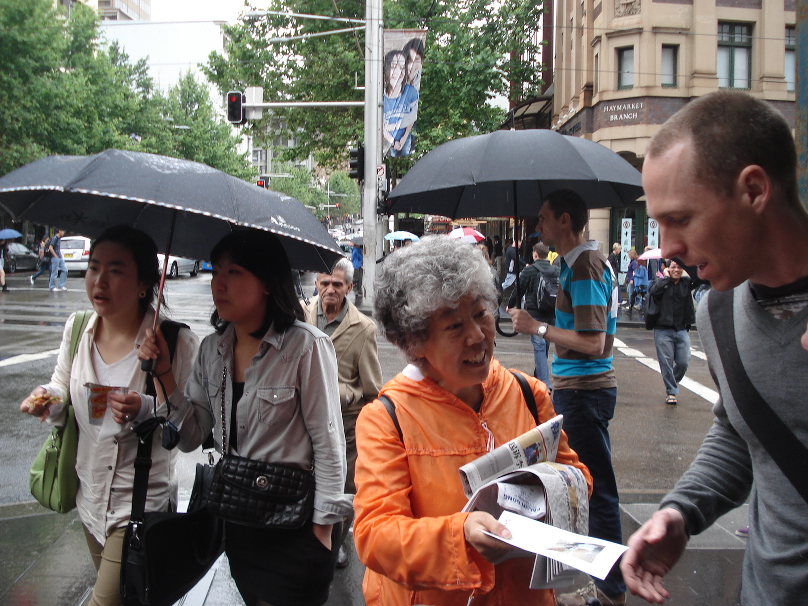 有几位中国留学生围在真相展板前看,互相之间议论纷纷,学员走过去与他们攀谈起来,提到“三退”时,一位留学生说:“我从小淘气,功课不好,连少先队都没入过。“学员说,没入过党、团、队组织是好事,但是如果真的加入过,哪怕是戴过红领巾,而不声明退出来,那可是害了自己,将来中共被淘汰时会跟着它遭殃。那位留学生诚恳地说:“谢谢你们的好意,我真的没戴过。”学员请他记住“法轮大法好,真善忍好”,他感激地说:“谢谢,我会把这句大福大贵的话告诉家里人。”