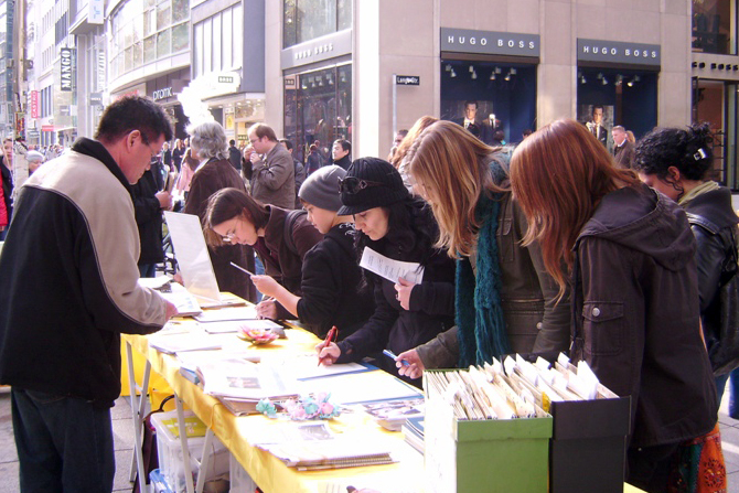 ![]() 过往民众纷纷纷纷驻足了解真相,并签名支持制止迫害。 |